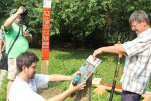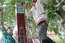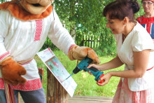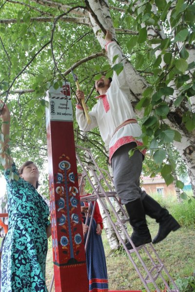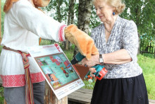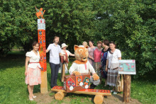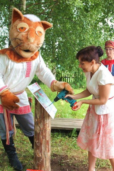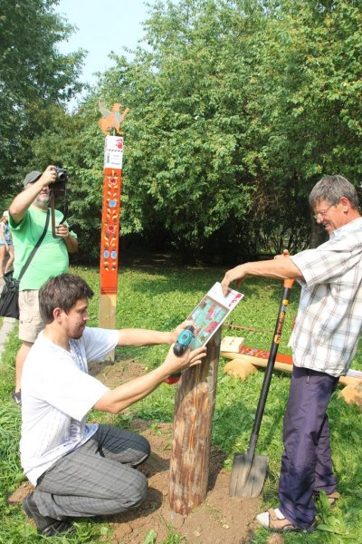 Завершающим сюжетом церемонии открытия арт-объекта на тотемской земле стало скрепление творческого союза между партнёрами проекта. Директор Тотемского музейного объединения Новосёлов Алексей Михайлович, автор проекта, руководитель музея "Семёнково" - Киршина Наталья Олеговна и научный консультант, заведующий художественным отделом Вологодского музея-заповедника - Глебова Ангелина Аркадьевна установили информационную панель с картой туристического маршрута "Дорогами грифонов и райских кущ", вкрутив последние винтики в успех начинания.
