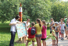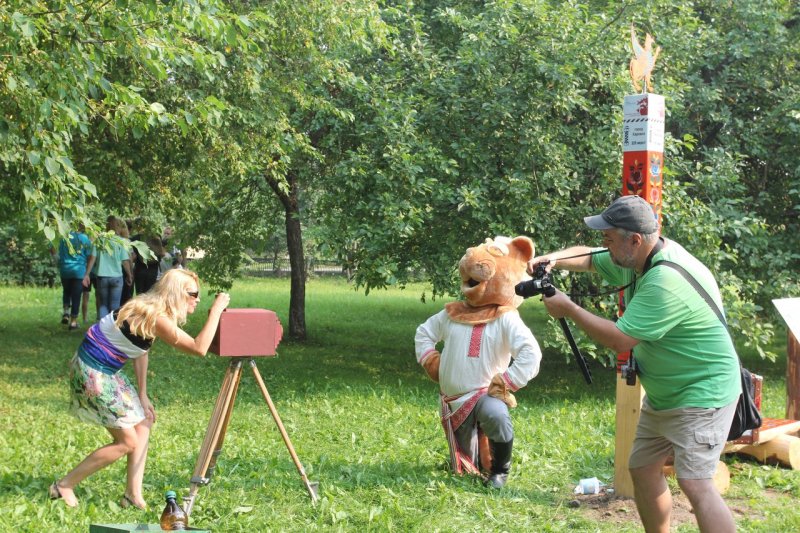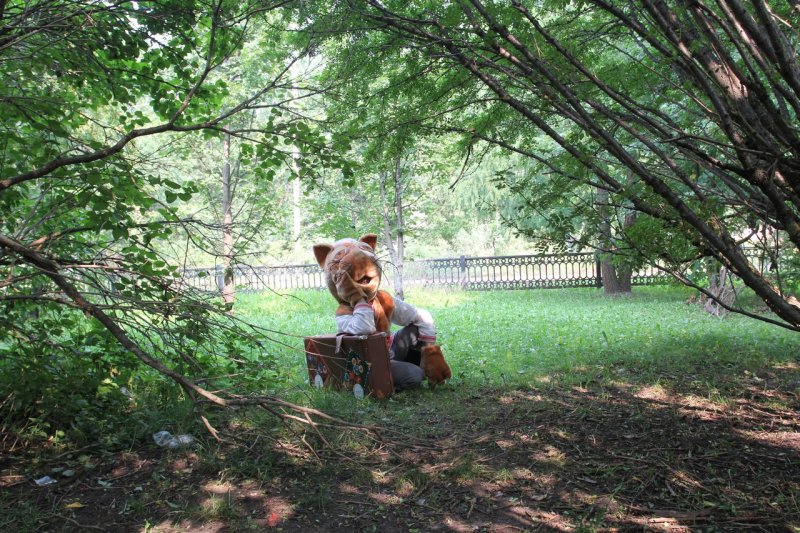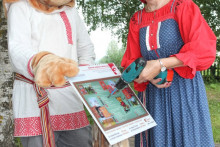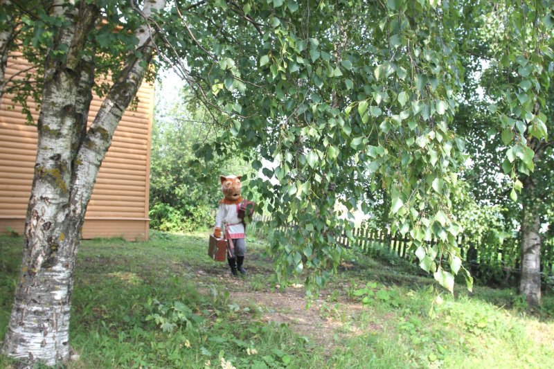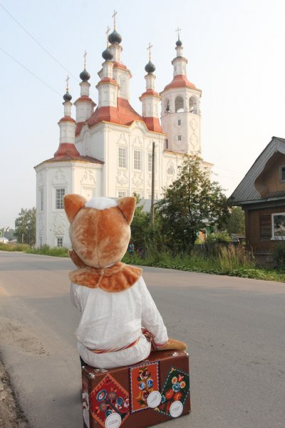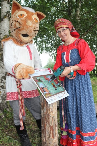 Время за игрой и интересными занятиями пролетело незаметно. И вот уже команда проекта в Тотьме устанавливает новый арт-объект: особенный, отличный от других. В лучах яркого солнца заиграла всеми красками тотемская роспись. Размашистые объёмные цветы на сурике и лев, напоминающий собачку, привлекли внимание и Кота Семёна. Неожиданно появившись из зарослей кустарника, он нацелил объектив фотоаппарата на роспись. Уже через мгновение появилась памятная фотография. Семён быстро нашёл ей место, прикрепив на крышку чемодана, с которым он в путешествии никогда не расстаётся, ведь там хранятся игры с росписями для детей и взрослых.