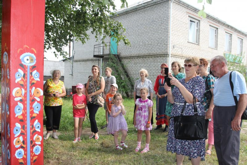 Под сенью высоких деревьев у входа в музей решили установить арт-объект, и уже через час музейный дворик преобразился. На карте Вологодчины появилось ещё одно место, охраняемое таинственным грифоном. Новость разлетелась быстро и вызвала интерес жителей села им. Бабушкина. К собравшимся обратилась руководитель проекта Наталья Киршина. Она предложила не отказывать себе в удовольствии путешествовать и поделилась идеями проекта "Дорогами грифонов и райских кущ". Заслуженный работник культуры Глебова Ангелина Аркадьевна обратила внимание всех на роспись, которой оформлен арт-объект. Свободно-кистевая роспись, созданная по мотивам работ творившего на этой земле мастера начала XX века Михаила Павловича Осетрова, по праву может служить узнаваемости территории, являясь маркером места.