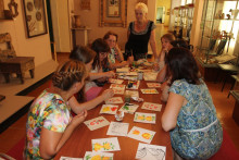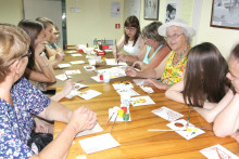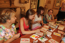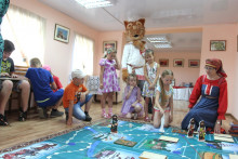 Всеобщую радость вызвало появление Кота Семёна. Он находился в приподнятом настроении и, конечно, предложил поиграть. Это были необычные игры - игры с росписями. Пока взрослые под руководством народного мастера России Гладышевой Ольги Константиновны знакомились с отличиями свободно-кистевых и графических росписей, дети путешествовали в мир красоты с игровым кубиком в руках и ловко перемещали костяшки в попытке сложить изображения из отдельных фрагментов.