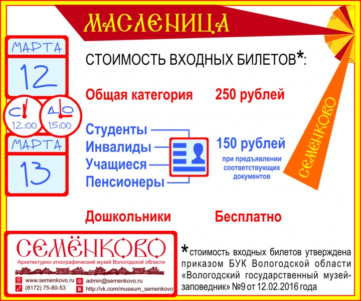 Стоимость входных билетов на мероприятие "Широкая Масленица" в Музее "Семёнково"