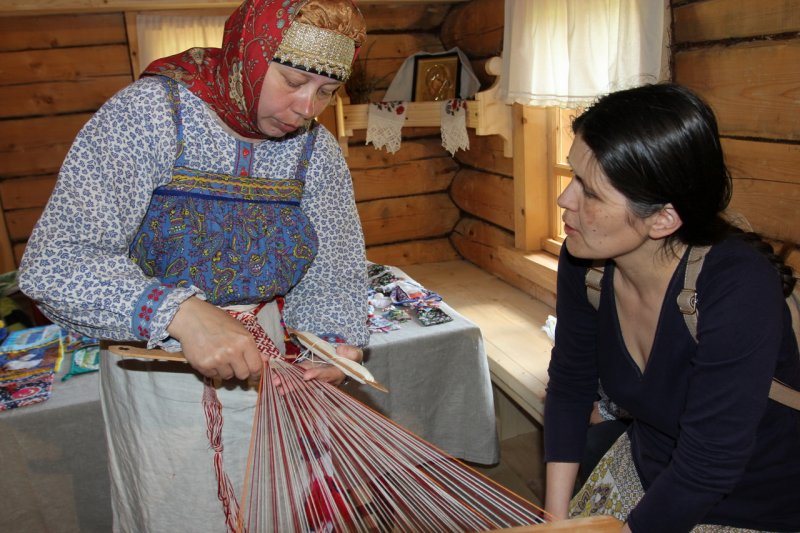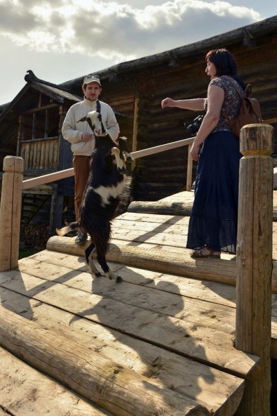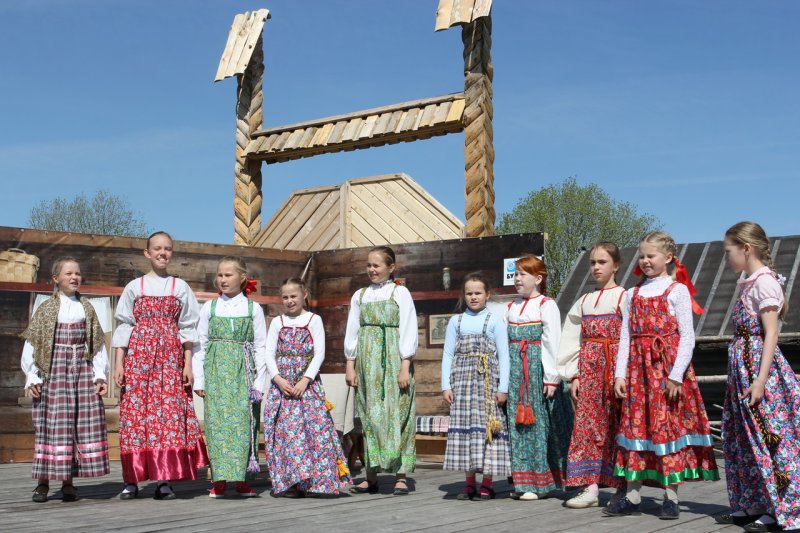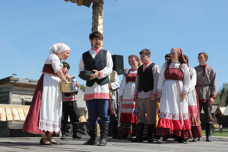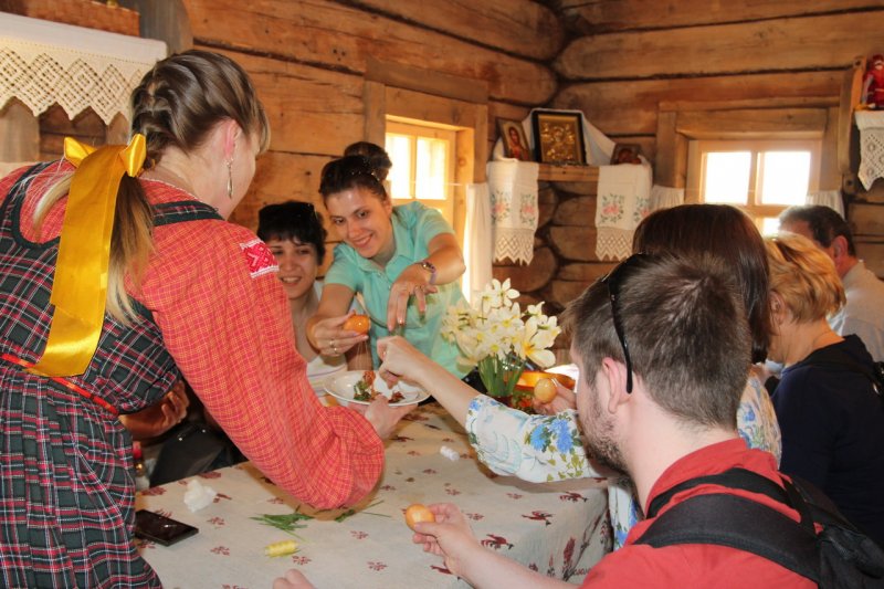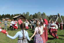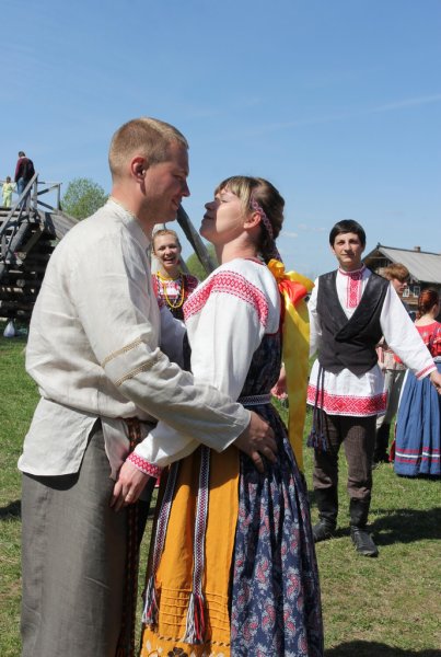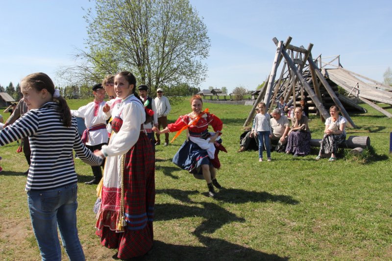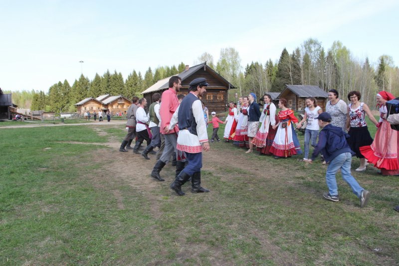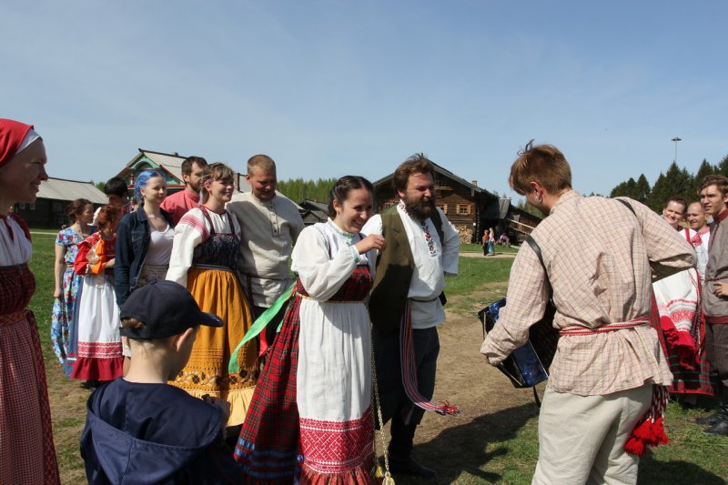 У высоких качелей было многолюдно. Парни в обмен на крашеные яйца качали девушек и кружили в плясках. Целовальные игры, хороводы, пение частушек под гармонь - всем этим жила деревня в прежние времена, всем этим живёт музей сегодня.
