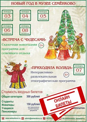 Приближается время волшебства и сказки. Мы стараемся сделать праздники особенными и запоминающимися. Ежегодно музей в новогоднюю пору посещает несколько тысяч человек. Если вы не хотите терять драгоценное время, простаивая в очередях за входными билетами мероприятия "Встреча с чудесами" или "Приходила коляда", то предлагаем вам воспользоваться возможностью приобретения билетов онлайн!