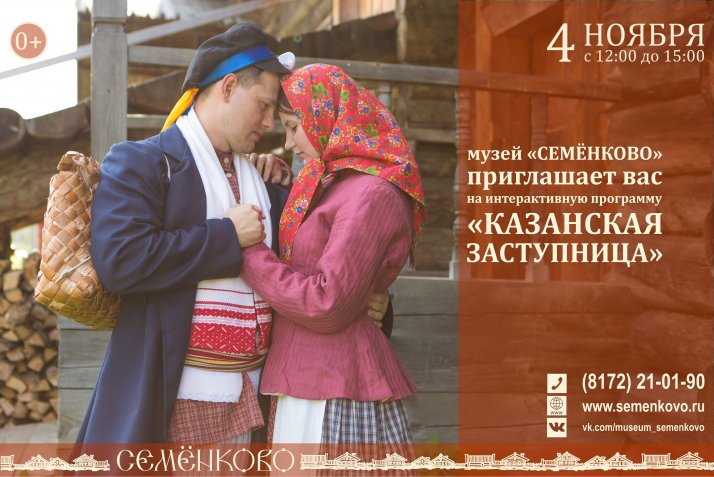 «Выезжаешь о Казанской на колёсах, а полозья в телегу клади», - беспокоились прежде мужики. До Казанской – не зима, с Казанской – не осень. По погоде в этот день судили и о предстоящей зиме, и о будущем урожае. Пойдёт на Казанскую дождь – зима будет снежная, а урожай богатый. Музей «Семенково» приглашает всех 4 ноября на праздничную интерактивную программу «Казанская заступница». Вы сможете погрузиться в жизнь северной русской деревни конца XIX – начала XX века, узнать больше о традициях этого периода.