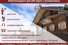 В рамках Клуба выходного дня предусмотрены дополнительные музейные услуги за отдельную плату: экскурсия о быте и жизни наших предков, мастер-классы по валянию из шерсти, росписи, выпечке пряников,интерактивные программы.