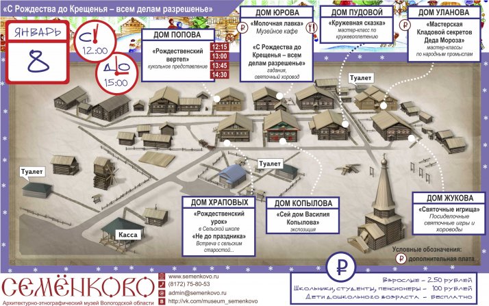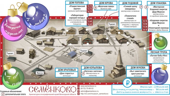 Приближается самое таинственное и волшебное время. Приглашаем вас весело, увлекательно и познавательно провести праздничные новогодние дни в музее «Семенково»! Мы приготовили для вас немало неожиданных сюрпризов. Не сомневайтесь, у нас будет интересно и взрослым, и детям! Мечтайте и планируйте отдых в "Семёнково" среди сверкающих снегов и могучих северных домов за чашкой крепкого чая из самовара в хорошей кампании добрых друзей. Здесь, как нигде в другом месте, вам будет душевно и комфортно, вы ощутите морозное дыхание зимы и встретитесь с настоящими чудесами!