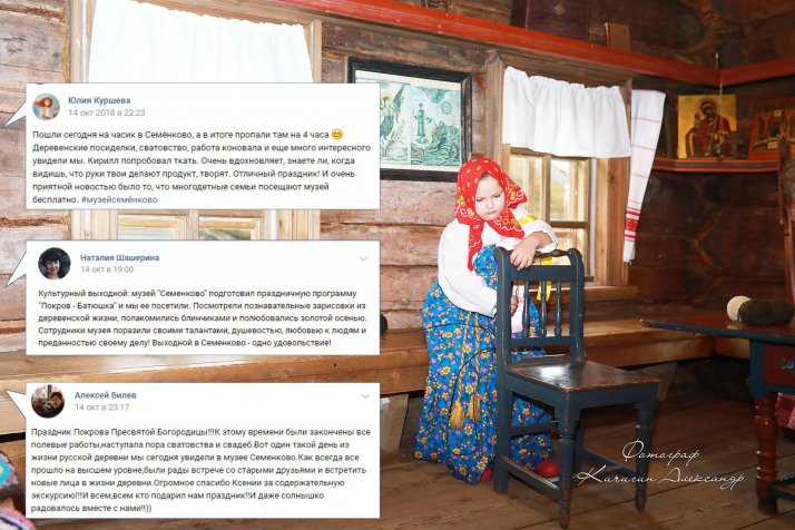«Культурный выходной: музей "Семенково" подготовил праздничную программу "Покров - Батюшка" и мы ее посетили. Посмотрели познавательные зарисовки из деревенской жизни, полакомились блинчиками и полюбовались золотой осенью. Сотрудники музея поразили своими талантами, душевостью, любовью к людям и преданностью своему делу! Выходной в Семенково - одно удовольствие!» - Наталия Шашерина (сохранена авторская пунктуация текста).