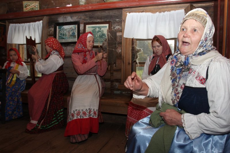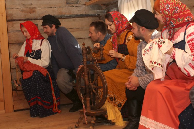 А в это время музей «Семёнково» потихоньку наполнялся людьми. Экскурсоводы подхватывали гостей «со всех волостей», увлекая в удивительное путешествие во времени. А чем жила деревня XIX века в осеннюю пору? У Жуковых прясть научились, у Поповых на посиделках поплясали да поиграли, Надежду к Валентину «припели», коновала повстречали, на сватовстве, на мастер-классах побывали, чай с блинами попивали.