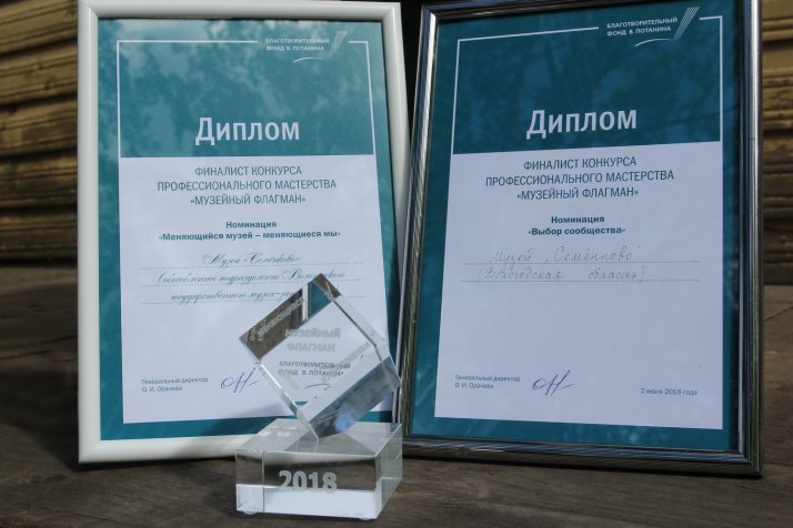 Наконец наступил долгожданный день. 2 июня всё внимание приковано к подведению итогов конкурса профессионального мастерства «Музейный флагман», учреждённого Благотворительным фондом Владимира Потанина. Музей «Семёнково» оказался в хорошей компании финалистов в номинации «Меняющийся музей – меняющиеся мы» наряду с Музеем Логистики (г. Санкт-Петербург) и Музейно-выставочным центром (Находка, Приморский край). К сожалению, количество голосов, отданных в результате открытого онлайн-голосования за наш музей, оказалось недостаточным для получения гранта. Но ощутить радость, восторг признания и поддержки нам всё-таки удалось испытать! Представители профессионального сообщества, сформировавшегося вокруг музейных программ фонда Потанина, и зрители проголосовали за Музей «Семёнково» в номинации «Выбор сообщества» конкурса «Музейный флагман»!!! Дипломы финалиста и победителя конкурса «Музейный флагман», а также отличительный знак - «кубик» победителя пополнили копилку трофеев и наград музея «Семёнково».