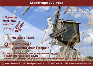 12 сентября 2021 года в 12:00 часов в музее "Семенково" состоится интерактивная программа "Помолом мельница стоит!"