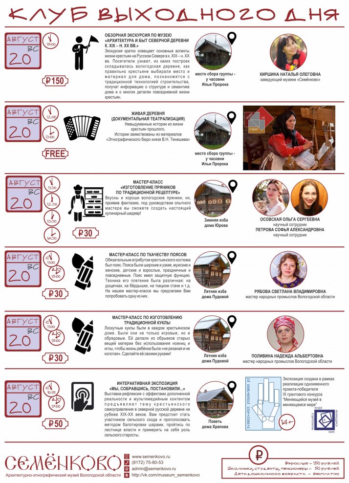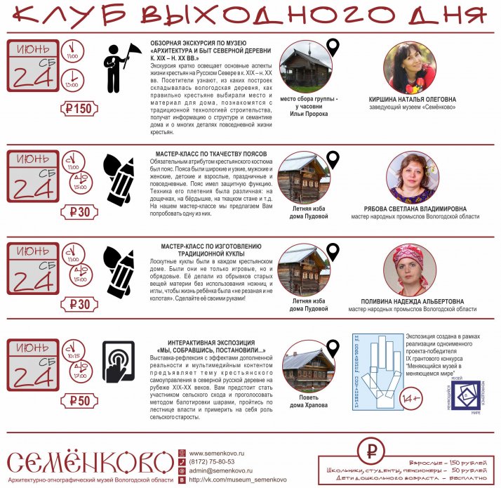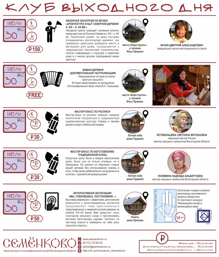 Кроме того каждые выходные для вас работают мастер-классы, лекторий, проводятся экскурсии и интерактивные программы, посетить которые вы можете без предварительной заявки. Познакомиться с программой Клуба выходного дня можно на сайте и в группах социальных сетей Bконтакте и Facebook.
