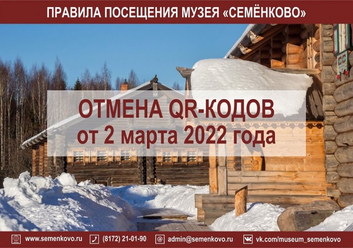 Уважаемые посетители! В связи с изменениями в постановлении Правительства Вологодской области от 16.03.2020 года № 229 от 2 марта 2022 года, сообщаем, что предъявление QR-кодов при посещении музея «Семёнково» не требуется!
