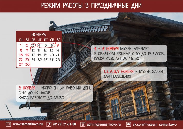 Музей "Семёнково" поздравляет вас с наступающим праздником - Днём народного единства и информирует о графике работы Музея в ноябрьские выходные дни.
