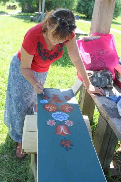 На этот раз гости музея увидели за работой мастера народных промыслов Вологодской области, хранителя Харовского историко-художественного музея - Петрову Галину Анатольевну. Она уверенными мазками виртуозно поставила на дыбы харовских львов, которые теперь зорко смотрят во все четыре стороны. Танцуют ли они при виде гостей или готовятся к нападению – судить вам.