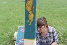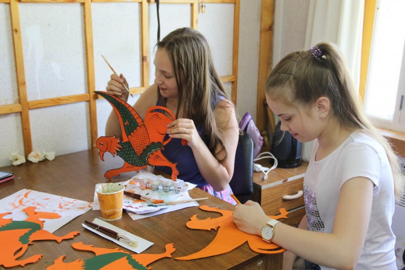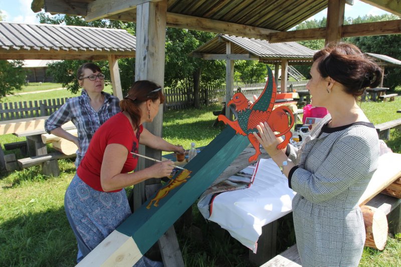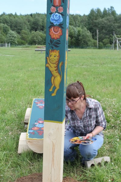 Одновременно с известным мастером в течение дня увлечённо работали учащиеся студии «Вологодские росписи». Они раскрасили заранее подготовленные силуэты сказочных грифонов. Один из них взлетел наверх расписного столба – указателя и занял на нём место флюгера. Другие грифоны ожидают продолжения Арт-сессии.