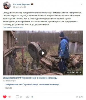 Наталья Киршина, заведующий музеем «Семёнково», в социальных сетях поделилась своими воспоминаниями о спасении ветряной мельницы А.П. Дурова из деревни Борок Тотемского района, восстановленной в музее благодаря проекту «Строим вместе» и компании «Северсталь»: