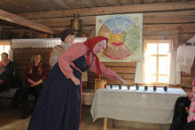Вспомните, как раньше выглядели деревянные ковши - скобкари или солонки! Силуэт их почти всегда напоминал утицу. Образ птицы был чрезвычайно любим русским народом. Не случайно изображения птиц  встречаются на рушниках, в вышивках. Всё это смогли увидеть гости праздника. А также они узнали больше о фантастических сказочных птицах, которые жили в легендах и сказаниях русского народа и нашли отражение в северных росписях.