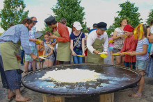 Всем миром жарилась яичная «селянка» на большой сковороде, накрывались столы. Душевно, бойко и весело гости общались за общим столом, делились впечатлениями и радостями.