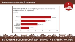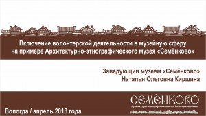 Как выжить музею в современных условиях без поддержки добровольцев? Это не праздный вопрос, а реальность, в которой живёт музей «Семёнково» уже более 10 лет.  Круг людей, помогающих музею, чрезвычайно широк, и музей дорожит этой дружбой и принимает её в разной форме. Волонтёры – это те, кто ежегодно приезжают на акцию «Весенние помочи»; те, кто наполняют музей жизнью; те, кто по первой просьбе откликаются и фотографируют  музейные праздники и будни и т.д. Что мотивирует всех этих людей вновь и вновь приезжать в музей, тратить своё личное время на репетиции, на разучивание текстов, на преодоление себя? Какую роль играет сегодня музей в социуме, и что может обеспечить ему будущее, а значит и сохранение памяти о сильной деревне, о деревянном прошлом. Об этом шла речь в рамках двухчасового семинара, который провела руководитель музея «Семёнково» Наталья Киршина.