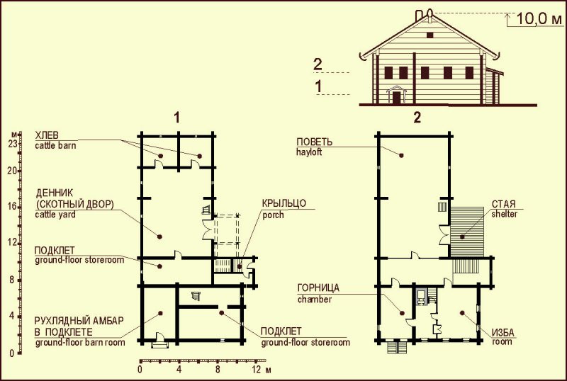 Размеры дома в осях плана составляют: общая длина – 23,2 м, ширина жилой части 10,8 м, ширина двора – 7,8 м.