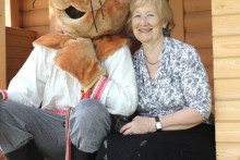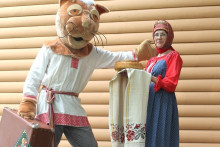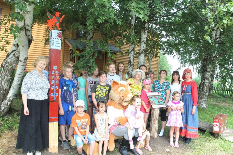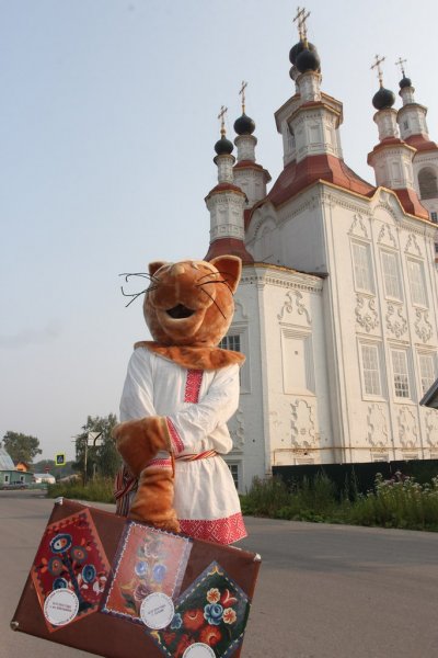 Время за игрой и интересными занятиями пролетело незаметно. И вот уже команда проекта в Тотьме устанавливает новый арт-объект: особенный, отличный от других. В лучах яркого солнца заиграла всеми красками тотемская роспись. Размашистые объёмные цветы на сурике и лев, напоминающий собачку, привлекли внимание и Кота Семёна. Неожиданно появившись из зарослей кустарника, он нацелил объектив фотоаппарата на роспись. Уже через мгновение появилась памятная фотография. Семён быстро нашёл ей место, прикрепив на крышку чемодана, с которым он в путешествии никогда не расстаётся, ведь там хранятся игры с росписями для детей и взрослых.