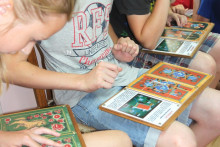 Всеобщую радость вызвало появление Кота Семёна. Он находился в приподнятом настроении и, конечно, предложил поиграть. Это были необычные игры - игры с росписями. Пока взрослые под руководством народного мастера России Гладышевой Ольги Константиновны знакомились с отличиями свободно-кистевых и графических росписей, дети путешествовали в мир красоты с игровым кубиком в руках и ловко перемещали костяшки в попытке сложить изображения из отдельных фрагментов.