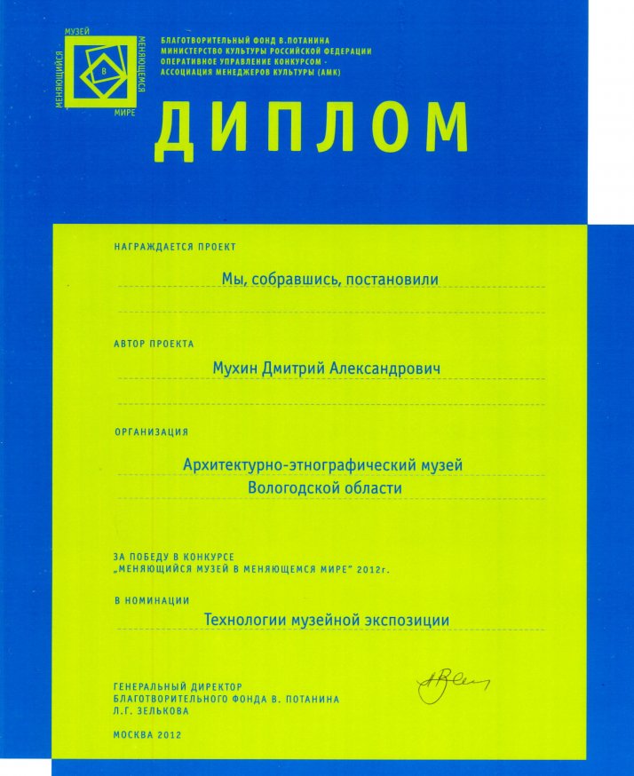 13 сентября 2012 года в рамках церемонии торжественного награждения победителей IХ грантового конкурса «Меняющийся музей в меняющемся мире», учрежденного Благотворительным фондом В. Потанина, диплом победителя получил заведующий научно-экспозиционного отдела музея «Семёнково» - Дмитрий Александрович Мухин – автор проекта «Мы, собравшись, постановили…»
