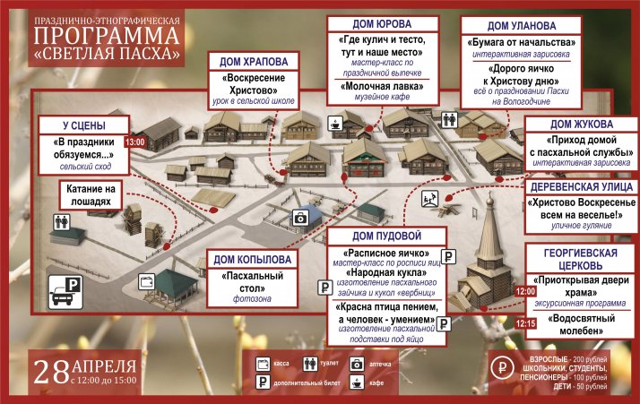 Каждый пришедший в музей сможет оценить высоту её деревянных сводов. В торжественной и одновременно уютной атмосфере храма пройдёт водосвятный молебен. Батюшка осветит принесённые крашенные яички, пасхальные куличи, пироги, и выплеснется праздник на деревенскую улицу.