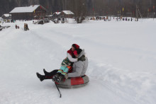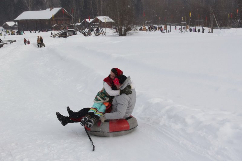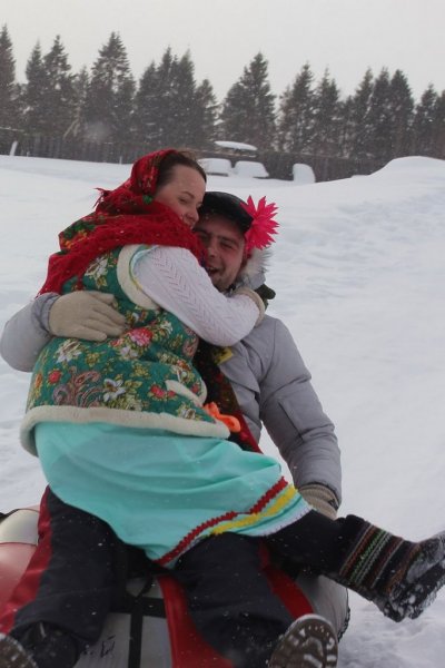 Полакомившись, молодые отправились покорять горку. Катались "на лён долгий", на урожай щедрый. Задорно выкрикивали заклички, призывая весну, да целовались, утверждая любовь!