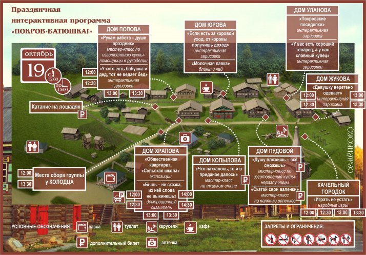 В программе: интерактивные зарисовки «Девушку веретено одевает», «Если есть за коровой уход, от коровы получишь доход», «У вас есть хороший товарец, а у нас славный купец», «У кого есть бабушка и дед, тот не ведает бед», «Покровские посиделки»; мастер-классы по ткачеству, изготовлению кукол-неразлучников, валянию из шерсти; народные игры; катание на лошадях и др.