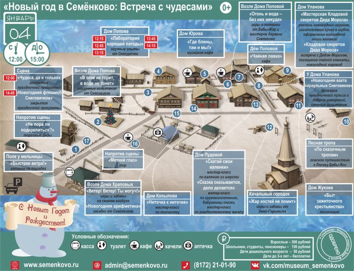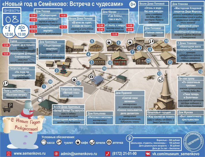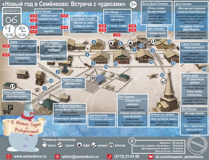 Музей "Семёнково" предлагает отправиться в необычное путешествие на встречу с Новым годом. Подчищайте то, что не успели сделать в текущем 2018 году и занимайте самые лучшие места. Где? Сперва у окошек собственных квартир и домов, чтобы не пропустить позывные зимы. Как только стёкла затянутся морозным узором, а снежинки напрочь вскружат вам голову, бегом в новый год! На лыжах или санках, собачьих упряжках или лошадях, главное, важно оказаться в нужном месте и в правильный час! Там, где концентрация смеха, улыбок, детского восторга и счастья зашкаливает! С 3 по 6 и 8 января сказочная "Кладовая секретов Деда Мороза", известная среди вологжан и не только их, как музей "Семёнково", обещает долгожданную встречу с чудесами!