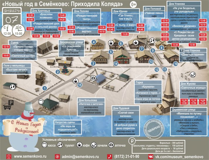 7 января, в праздник Рождества Христова, в музее пройдёт интерактивная этнографическая программа «Приходила Коляда». Ожившие сцены деревенской жизни станут настоящим откровением и подарком для путешественников, открывающих для себя Русский Север! Вдыхая зимнюю прохладу и созерцая красоту деревни, ощутите глубину народной традиции! Испытайте светлую радость от встречи с колядой и подивитесь настоящему вертепному представлению. В пору "безвременья" наипервейшее дело: выпустить дух и пуститься в пляс! Гадания, ряженье, поцелуи пачками - это и многое другое ждёт вас в "Семёнково"!