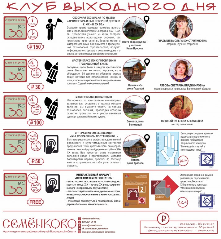 В эти выходные заканчивает свою работу "Клуб выходного дня" в музее "Семёнково". Не упустите последнюю возможность прогуляться по осеннему музею "Семёнково". 29 и 30 сентября вы сможете получить дополнительные музейные услуги: экскурсии и мастер-классы без предварительной записи.