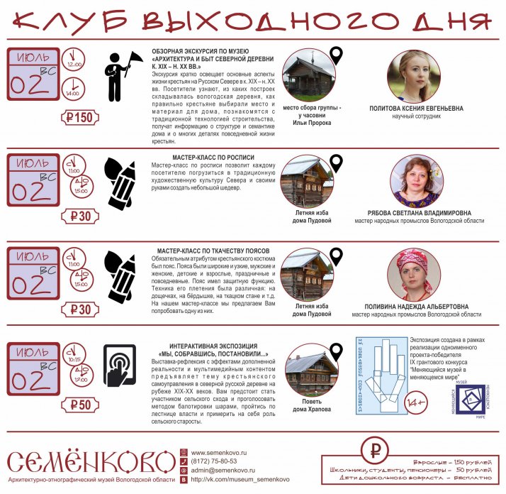 Кроме того каждые выходные для вас работают мастер-классы, лекторий, проводятся экскурсии и интерактивные программы, посетить которые вы можете без предварительной заявки. Познакомиться с программой Клуба выходного дня можно на сайте и в группах социальных сетей Bконтакте и Facebook.