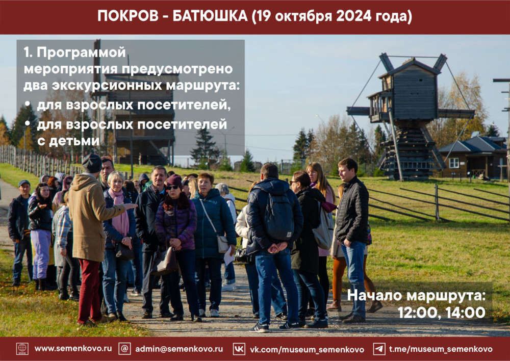 Приезжайте к нам на Покров! В программе мероприятия: два экскурсионных маршрута (начало в 12:00 и 14:00 часов), рекомендованных для взрослой аудитории и посетителей с детьми: посиделки и сватовство, приезд женихов и народные игры, вологодские сказки; мастер-классы по вышивке и кружевоплетению, изготовлению куклы-десятиручки; катание на лошадях и другое. В музейном кафе «Молочная лавка» - горячие блины и ароматный чай!