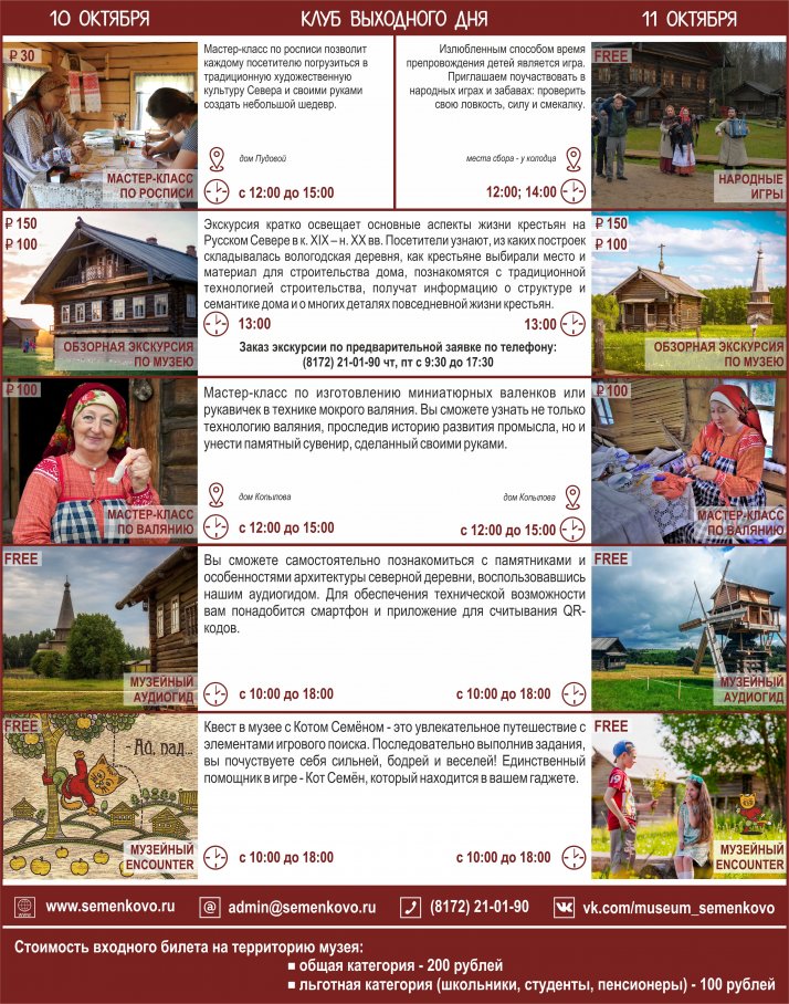 У вас есть возможность не только познакомиться с миром северной русской деревни рубежа XIX - XX веков, удивиться крестьянской изобретательности и практичности, но и покачаться на качелях, отдохнуть в беседке, укрывшись от солнца, а также принять участие в мероприятиях "Клуба выходного дня".