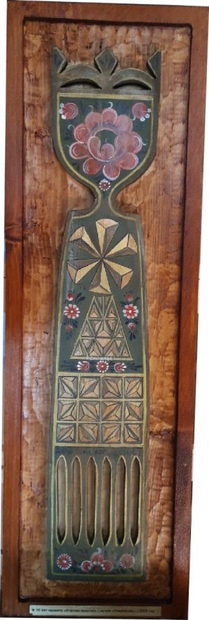 Подарок представляет собой богато декорированную лопасть прялки. Издревле на прялках сновали нить, которую фольклорное сознание соотносило с судьбой («нить судьбы», «красная нить»). Прялки украшали изображениями диковинных цветов и растительных побегов. Это мотивы цветущей Вселенной, отголоски мирового древа. Они являлись своеобразным благопожеланием на будущее, привлекали богатство и удачу в дом. Прялки украшались и глухой резьбой. Солярные розетки, полурозетки – символы солнца – играли роль оберегов, охраняли людей от бед и несчастий. Женщина, судьба, род оказывались под защитой космических начал. Если в будни прялка была орудием труда, то на праздник, на масленицу, на «пряслицах» скатывались с гор пряхи. "Катаемся с горок, чтобы лён был долог", - выкрикивали девушки, веря в хорошее будущее, в удачный аграрный год.
