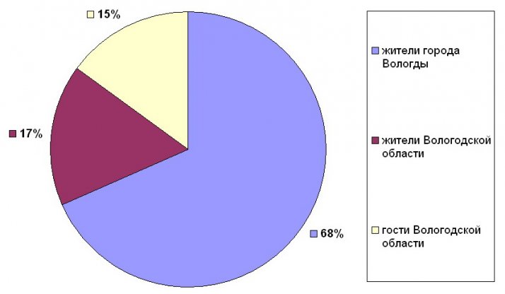 В праздновании Масленицы принимали участие в основном жители города Вологда (68,4%), а также Вологодской области (16,5%). Но важно отметить, что среди гостей мероприятия были жители Москвы, Ярославля и Северодвинска.
