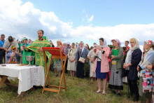 Шумными рядами, под звонкие наигрыши гармони и призывный колокольный звон, потянулись гости музея к Георгиевской церкви. Настоятель Храма Воскресения Христова посёлка Молочное иерей Иоанн Фомин совершил праздничный молебен прямо у стен храма великомученника Георгия Победоносца. Он осветил берёзовые веточки и поздравил молящихся с праздником Святой Троицы, желая, чтобы благодать Святого Духа пребывала с ними как можно дольше.