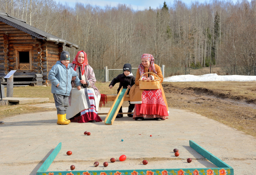 А после зажила, задышала музейная деревенька «Семёнково»: в торговой лавке бойко торговали, работника нанимали, гостей за праздничным столом поджидали. Детишки на качулях качались, на улице плясали, «христосовались», по дворам яйца собирали, в луковой шелухе красили да по желобам катали.