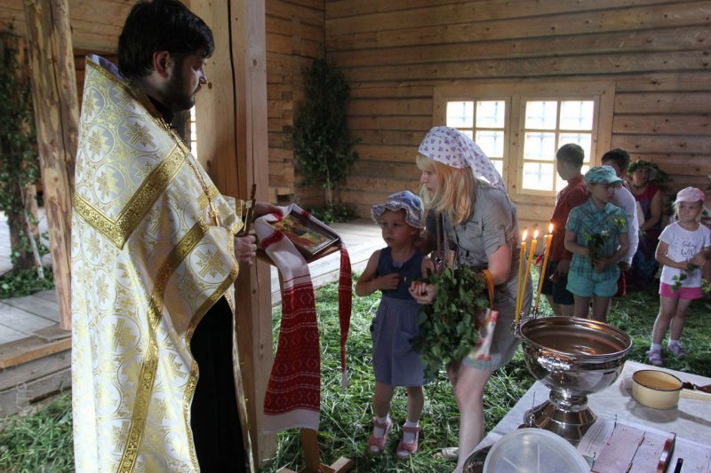 Троица – это большой Православный праздник. В 13.00 празднично украшенная травой и березами Георгиевская церковь встретила гостей. Иерей Михаил Болотский из церкви Антипия, епископ Пергамский, провел водосвятный молебен, где каждый мог послушать богослужение и осветить березовые веточки.