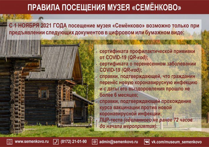 Уважаемые посетители! Обращаем ваше внимание, что с 1 ноября 2021 года в соответствии с Постановлением Правительства Вологодской области № 1154 от 08.10.2021 "О внесении изменений в постановление Правительства области от 16 марта 2020 года № 229" (далее – Постановление) посещение музея "Семёнково" возможно только при предъявлении следующих документов в цифровом или бумажном виде: