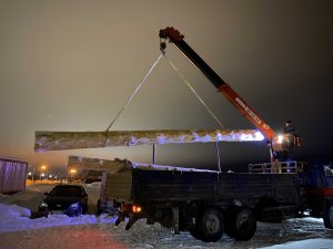 В этот же день удалось при помощи крана разместить в мельнице несколько крепких 7-метровых закладных брёвен. Они были заготовлены ещё летом 2021 года специалистами лесопромышленного концерна Кипелово по заказу музея. Этот материал будет служить основой для площадки, удерживающей "шапку" шатровой мельницы над нижней частью сооружения.
