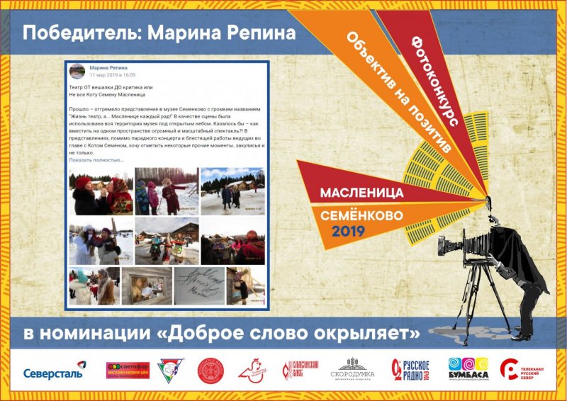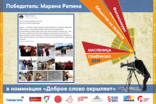 - Номинация «Доброе слово окрыляет» по праву достаётся Марине Репиной, автору наиболее креативного и содержательного отзыва о «Масленице в Семёнково».