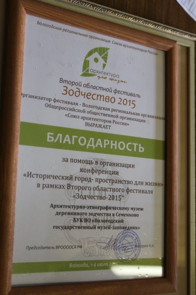 Второй год подряд по инициативе Вологодского отделения Союза архитекторов России в Вологде проходит региональный фестиваль "Зодчество-2015". Маститые и опытные архитекторы наряду с молодыми и только начинающими обсуждали будущее Вологды и малых исторических городов. Музей "Семёнково" выступил площадкой для научно-практической конференции "Исторический город - пространство для жизни".