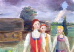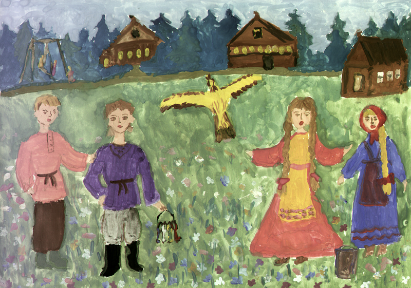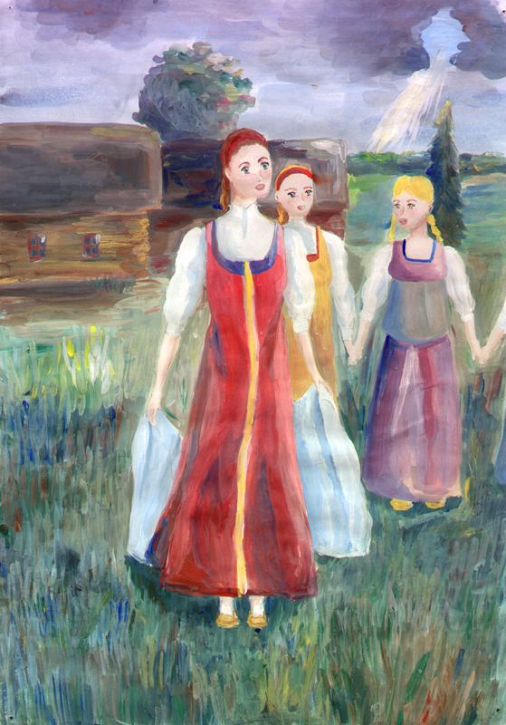 Весть та из уста в уста в один миг всю округу облетела, обошла. Опечалился люд честной, призадумался… Да только Марьюшка – певунья в уныние не впала. Затянула она песнь долгую, звонкую, до небес слышную, такую, что даже небо разверзлось, солнце из-за туч показалось. Подружки ее песнь подхватили, и на душе у всех повеселело.